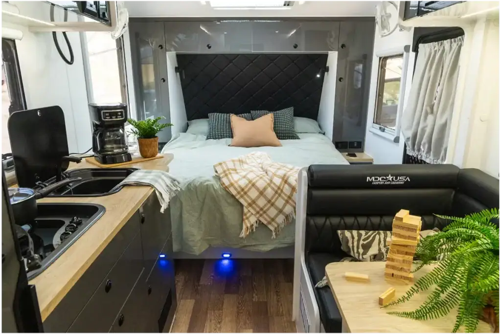 The storage does’t stop there. Surrounding the bed features deep overhead cabinets. These cabinets feature double-latch hardware that will keep doors securely shut even when bouncing along rugged trails. Side tables next to the bed also have drawers and cabinets for smaller belongings, plus charging ports to keep devices close at hand.