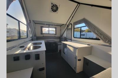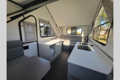 You'll love the amount of convenience and comfort found in this A-frame camper! There is a booth dinette up front that convert to a 40" x 80" bed, along with a rear sofa that converts to a 60" x 80" queen-size bed. Prepare your best meals on the two-burner cooktop, use the sink to clean up, and store cold items in the 3.2 cu. ft. 12V refrigerator. This unit also includes a 200-watt solar panel on the front dormer, and an optional 200-watt solar panel can be added to the rear dormer for even more off-grid capabilities!