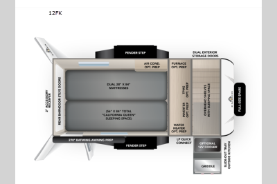 This lightweight travel trailer will get you out in nature quicker and easier than you think! Once you arrive at the campground, you can unload the dual exterior storage doors and your gear from the rear 2" accessory receiver. The front outdoor kitchen includes a slide out tray with a griddle plus an optional 12V cooler, allowing you to cook lunch before taking a hike. Inside, the dual mattresses convert to a 56" x 84" "California Queen" sleeping space, plus there are front overhead shelves with sleeping space for an additional guest or two little ones. There is also optional prep for utilities, including furnace, A/C, water heater and more!