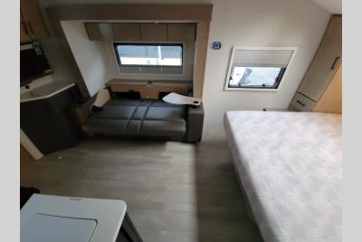 You're going to love everything about this travel trailer that can comfortably sleep three to six people each night, depending on your bunk configurations. There is a spacious storage locker that can be used for hiking gear, plus a kayak/bike storage door for quick and easy packing. The Embertrack system lets you convert the benches to twin bunks, double-size bunks, a desk, or remove them altogether for more storage space. You will enjoy the queen-size Murphy bed up front, along with the "stargazer" skylight for nighttime views, along with dual nightstands and dual wardrobes to keep your clothes tidy. And in the morning you can relax on the jack-knife sofa with a removable table once the bed is put away. This trailer also includes a full kitchen with a 12V refrigerator, an air fryer convection microwave oven, a dual burner cooktop, and a stainless steel sink for easy clean-up.