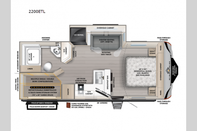 You will love camping in this versatile travel trailer! There is a repositionable EmberTrack E-Track bunk/storage system with single and double-size bunk configurations, depending on your needs, plus a fold-up Bar-V window that overlooks the exterior fold-down bar top/door. You'll find your own semi-private bedroom up front with a walk-around queen bed, dual nightstands and wardrobes, plus an overhead cabinet for ample storage. An optional Murphy bed can be chosen in place of the queen bed if you're needing more seating space during the day! The dual-burner LP cooktop and air fryer convection microwave will let you make meals each day, and there is a breakfast bar with bar stools where you can dine together. This unit also includes a slide out with theater seating with rotating side tables for the ultimate place to relax, plus there is a 12V refrigerator and overhead cabinet here for more storge space!