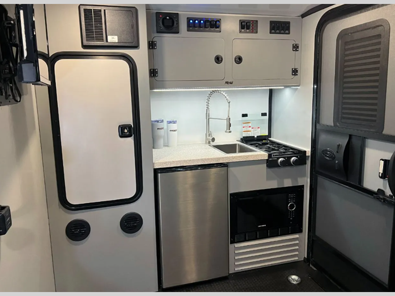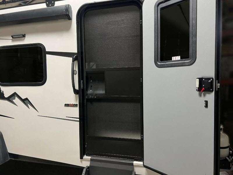 You won't find wood in any of the ROG's construction. Instead, Encore RV has opted to use aluminum and fiberglass to create a lightweight product that won't rust or corrode. You also won't find any wood in the kitchen cabinets because these are made of aluminum too, and there are solid surface countertops that are easy to keep clean.