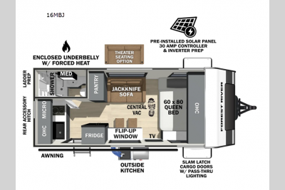 Each is built with a fully walkable PVC roof, a welded aluminum structure, and an enclosed underbelly with forced heat and radiant foil insulation for added protection against the elements. There are premium window treatments inside, along with convenient motion lighting, a 4-speed high powered bath fan, and more comforts. The optional Black Canyon Beast Mode Package can be added if you want an independent suspension, 400-watt solar panel, fresh water filter, and Maxxair roof vent cover.