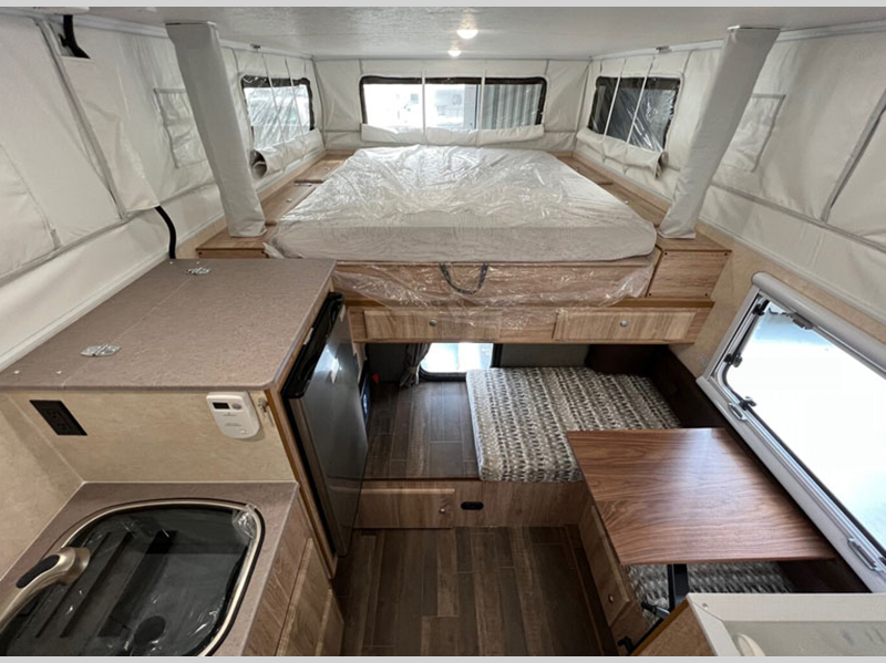 Sleeps 3 Length 12 ft 2 in Ext Width 6 ft 5 in Int Height 6 ft 11 in Dry Weight 1258 lbs Fresh Water Capacity 17 gals Refrigerator Type 12V Compressor Refrigerator Size 3.5 cu ft Cooktop Burners 2 Floor Length 6 ft 3 in Center of Gravity Front 22 in Truck Bed Size Short/Long Body Style Pop-Up Electrical Service 30 amp Solar Wattage 200 watts Similar Floorplans