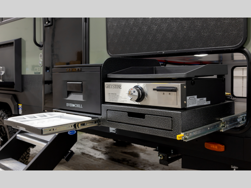 - Outside Pullout Kitchen with 12V drawer Refrigerator, Gas Griddle, Collapsible Sink, Cutting Board, Detachable sprayer hose with hot and cold water