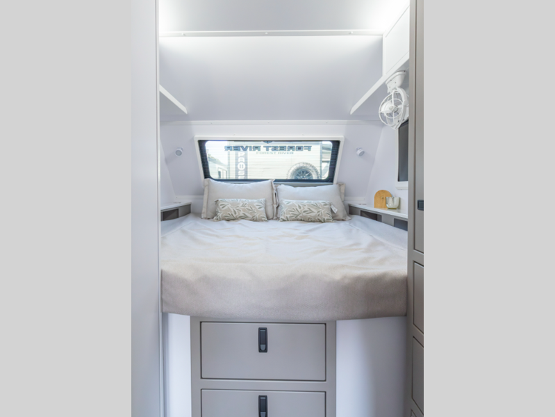 One of the key features and highlights on this trailer is the suspension, which for your convenience can be controlled in vehicle, using Garmin Tablet or APP. You have the ability to kneel the trailer, reducing height to the integrated bumps stomps, and you can raise the trailer to its maximum and of course level to set up camp in various terrains. Inside you'll find everything you may need to travel comfortably while still being able to be off-road if you want!