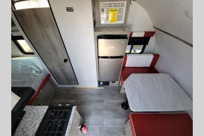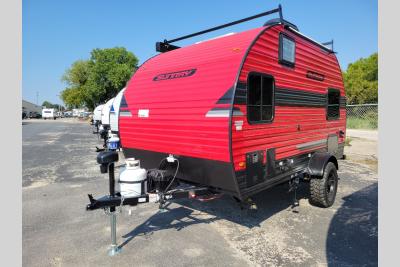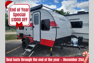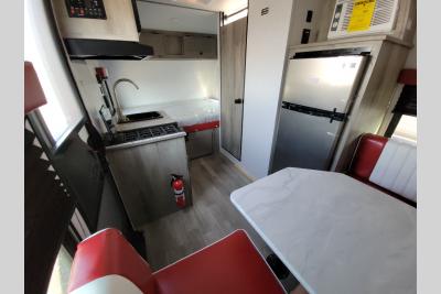 This Sunray travel trailer is the largest and most accommodating because it comes with a wet bath so that you can even take a shower in your trailer! There is a small kitchen on the interior that comes with a two-burner stove top, a refrigerator, and a microwave so that you can cook dinner without having to start a fire, and since it is indoors, you will be able to keep the bugs away while you prepare something delicious to eat. If you need to rinse off some gear, the outside shower will be especially useful, and if you need to charge your devices, use the USB ports. You will also find a Winegard HDTV antenna on this model.  Add the available Classic option for 14" tires instead of the off-road version, color matching rims with Moon Caps, and Retro decor and Diner-Style countertops.